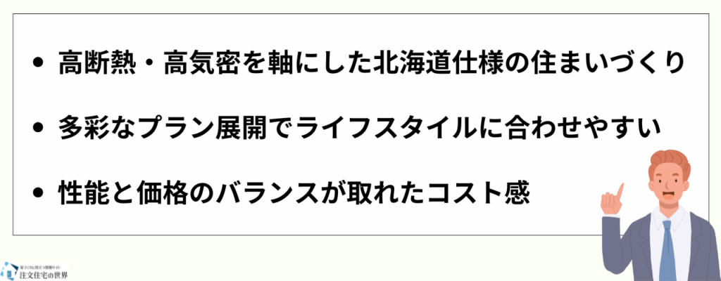 性能をしっかり確保しつつ、過度に高額になりすぎない価格帯に収まっているため、「長く住む家だからこそ、基本性能を妥協したくない」という価値観の方ほど満足度が高くなります。住んでからの快適さや光熱費、将来の暮らしまで見据えた家づくりをしたい方にとって、安心感と納得感を得やすい住宅会社といえるでしょう。