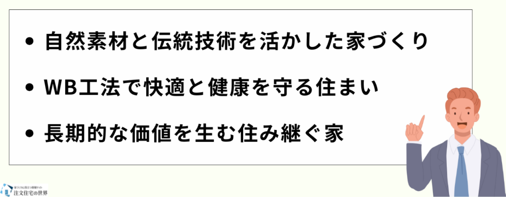 たとえば、大工による「手刻み」や自然素材を活かした施工、通気断熱WB工法など、住み心地や長期的な快適性を重視した仕様が挙げられます。また、完全自由設計による柔軟なプランニングや、家族ごとの暮らし方に寄り添う提案力も特徴です。さらに、地域密着型の施工体制により、アフターケアや信頼性の高さが確保されている点も支持を集める理由といえるでしょう。