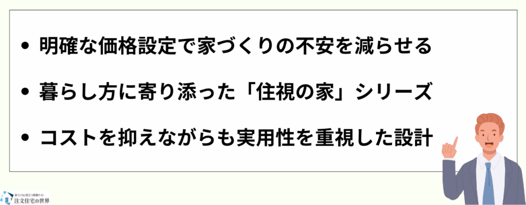 住視の家シリーズに代表されるように、家事動線、収納計画、LDKの使い方など、生活の中で繰り返される行動を丁寧に見つめ、実用性を重視した設計が特徴となっています。価格と仕様が明確なため、住宅購入に不安を感じやすい方でも検討しやすく、計画段階から安心感を持ちやすい点も魅力です。